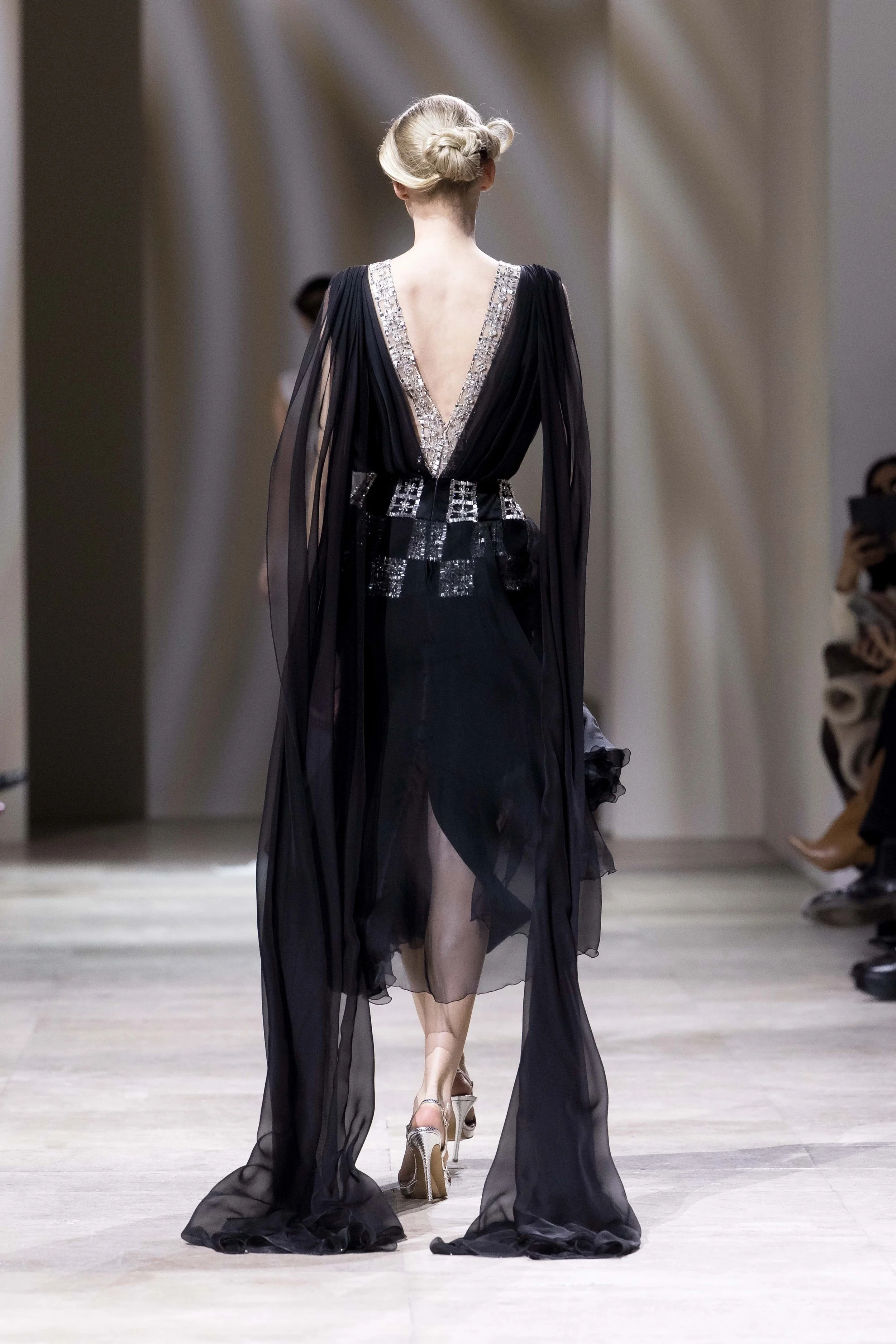 Sleeveless black silk chiffon midi dress with a deep décolleté blouson bodice and a diamanté plastron. The fitted bodice is cinched at the waist with a wide embroidered belt composed of mirrored square panels. Layered chiffon panels cascade from the shoulders and sides, creating a cape-like silhouette that flows behind the dress.
