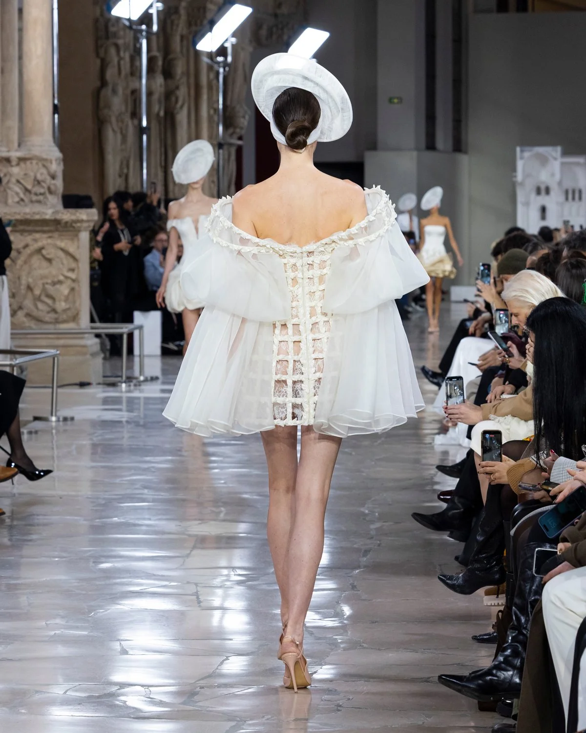 Ivory mini dress with floating straps, sculptural clasp corseted lattice bodice, dimensional satin bourgeon embroidery over delicate Chantilly lace, and voluminous sheer silk gazar sleeves. A structured crin de raffia hat.