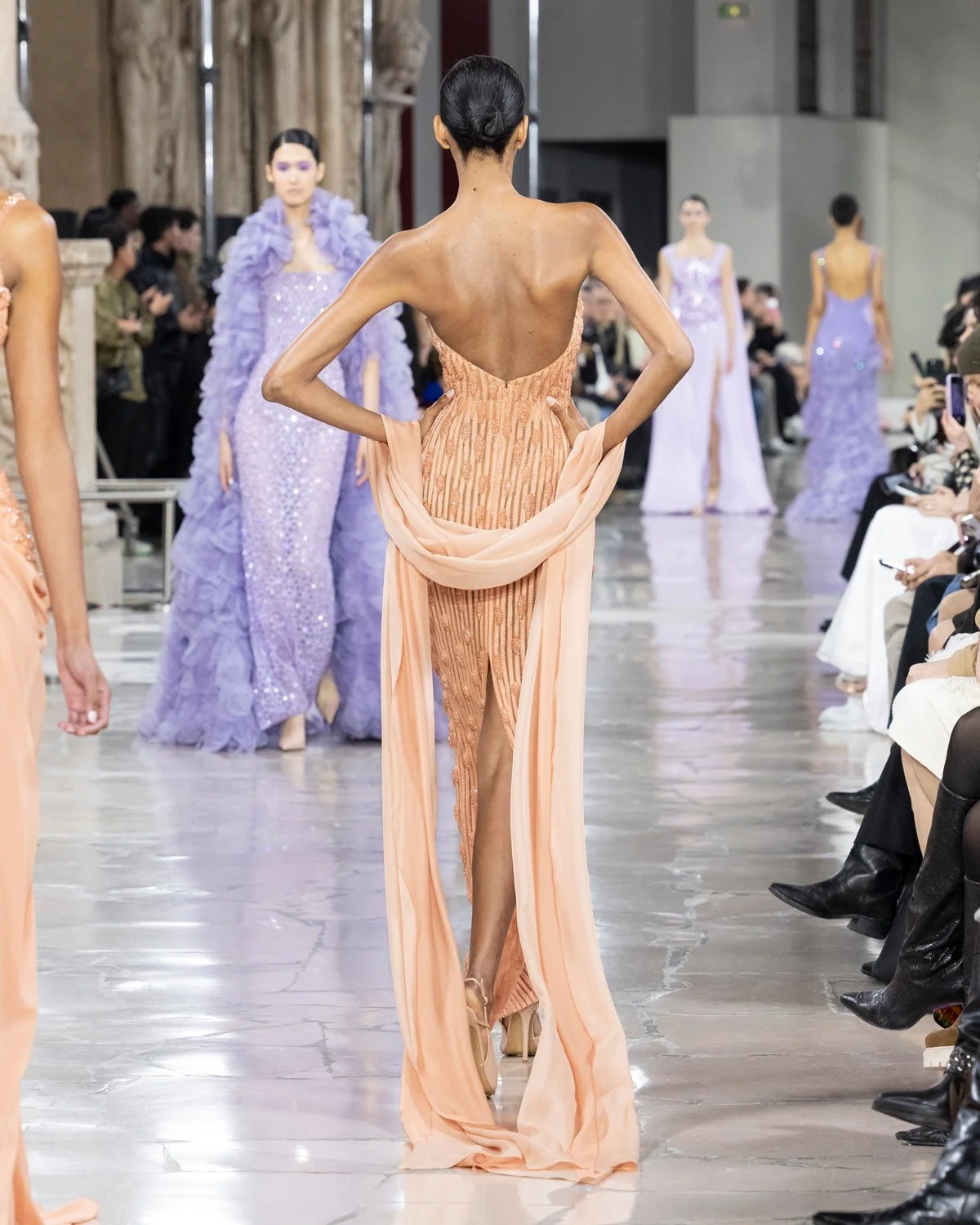 Apricot strapless column gown, fully hand embroidered with vertical three dimensional silk thread embroidery accented with crystals. A sheer chiffon scarf.