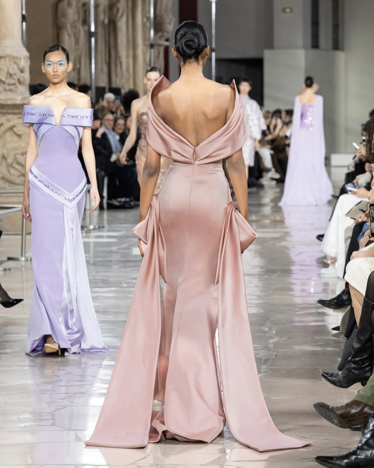 Luxe rose satin cuir gown with a sculptural geometric collar framing the shoulders. Crisscross satin bands shape the bodice and extend into knotted ribbon detailing at the hips, fluid satin panels and a trailing hem.