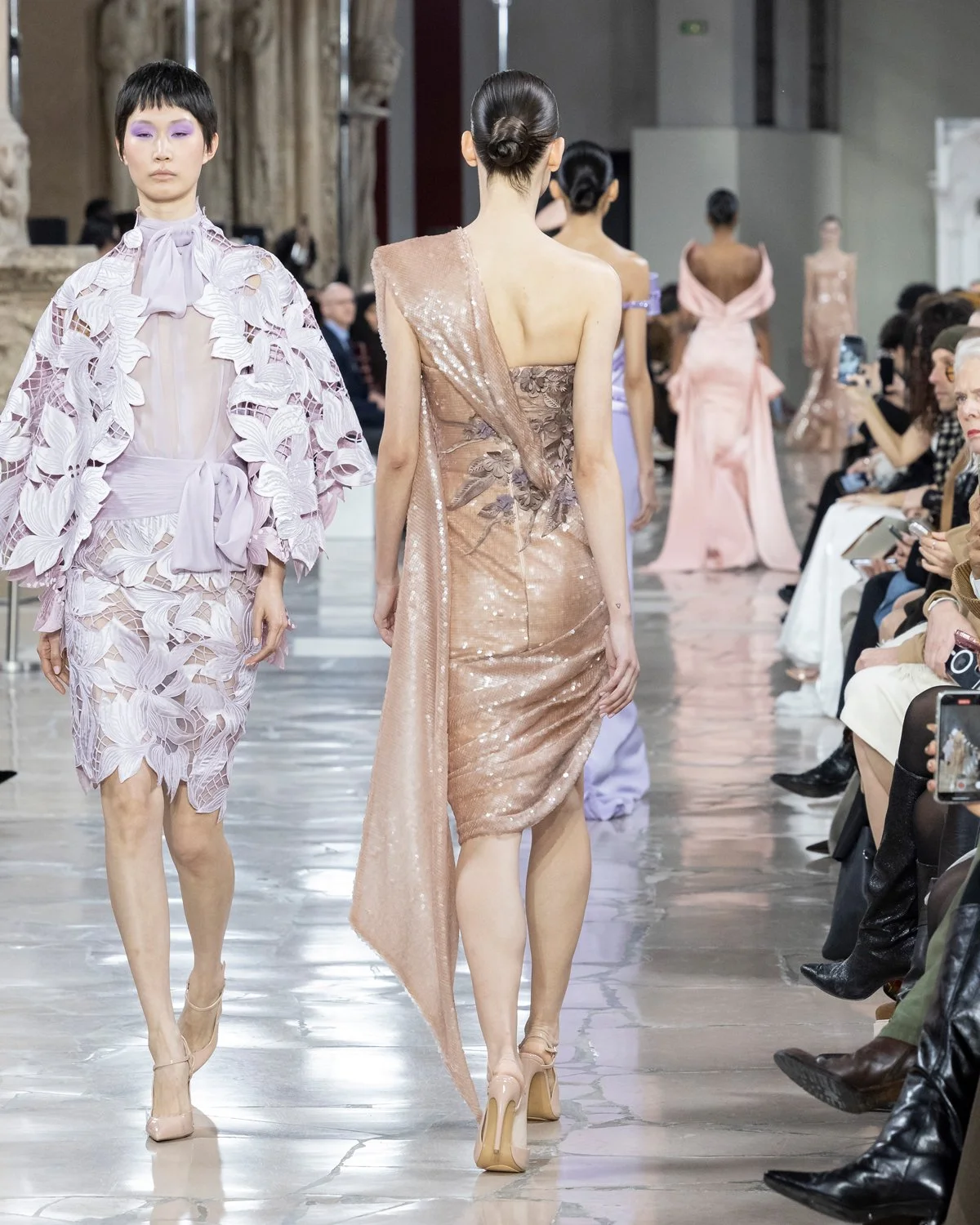 Strapless cocktail dress fully sequined in glossy nude paillettes, hand appliquéd feuille motifs in warm bronze brown, skirt is draped. Asymmetrical shoulder shawl panel extending from the bodice.